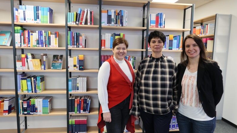 Das Bibliotheksteam am Standort Campus Bad Hersfeld der HGU vor den Bücherregalen der neuen Bibliothek. (v.l.n.r.: Leiterin Wissensmanagement & E-Learning Silvia Hartung, Bibliotheksassistentin Carola Post und Bibliothekarin Nicole Lindemann) A. Giebel / DGUV