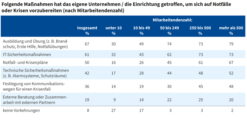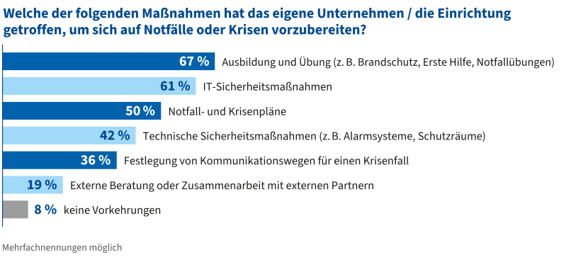 Gefragt nach den Vorkehrungen, die Unternehmen treffen, um für Notfälle oder Krisen gewappnet zu sein, werden am häufigsten Maßnahmen wie Ausbildung und Übung, zum Beispiel in den Bereichen Brandschutz, Erste Hilfe oder Notfalltraining (67 Prozent), IT-Sicherheitsmaßnahmen (61 Prozent) oder Notfall- und Krisenpläne (50 Prozent) genannt. Generell zeigt sich: Je kleiner das Unternehmen oder die Einrichtung, desto seltener wurden bereits Maßnahmen zur Krisen- oder Notfallvorsorge getroffen.